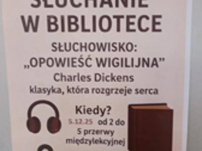 Magia słuchania w bibliotece szkolnejUczniowie naszej szkoły mieli dziś okazję poczuć świąteczny klimat, uczestnicząc podczas przerw w słuchowisku „Opowieść... -
