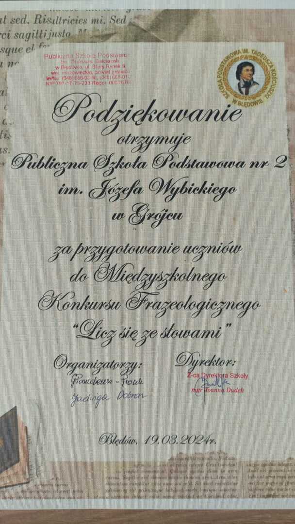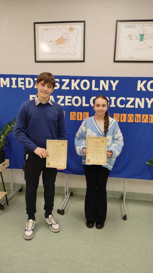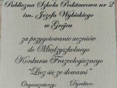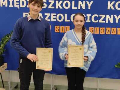 19 marca Kamila Królikowska z klasy 5b i Filip Skowroński z klasy 7c reprezentowali naszą szkołę w Międzyszkolnym Konkursie Frazeologicznym "Licz się ze słowami", który organizowała Publiczna Szkoła Podstawowa w Błędowie. O tytuł mistrzów frazeologii rywalizowało 10 dwuosobowych zespołów. Uczniowie rozwiązywali zadania, w których liczyła się znajomość związków frazeologicznych, pomysłowość i wyobraźnia.