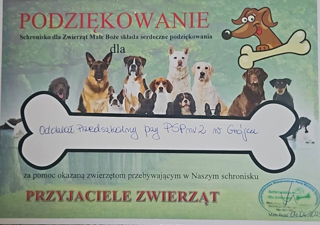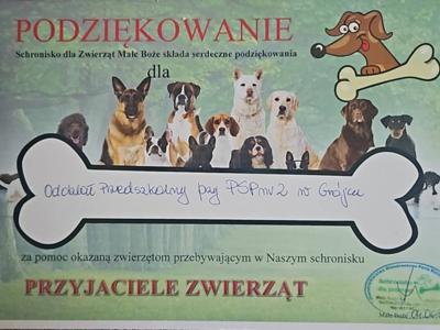 Celem tego przedsięwzięcia była poprawa standardu pobytu zwierząt w schronisku, kształtowanie postawy przyjaciela zwierząt oraz wdrażanie dzieci i osób dorosłych do aktywnego udziału w zbiórce karmy, kocy i ręczniczków. Organizatorem i koordynatorem akcji była pani Inga Binkowska. Cieszymy się, że tak wielu przedszkolaków odpowiedziało na nasz apel i wzięło udział w naszej akcji . Los bezdomnych, porzuconych zwierząt nie jest obojętny dzieciom naszego przedszkola. Dlatego dziękujemy serdecznie wszystkim przedszkolakom i rodzicom za włączenie się w zorganizowaną akcję charytatywną.