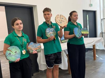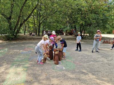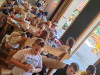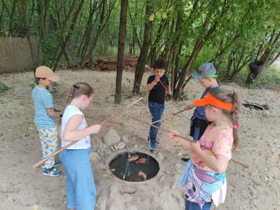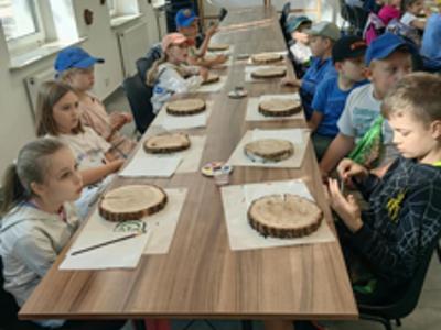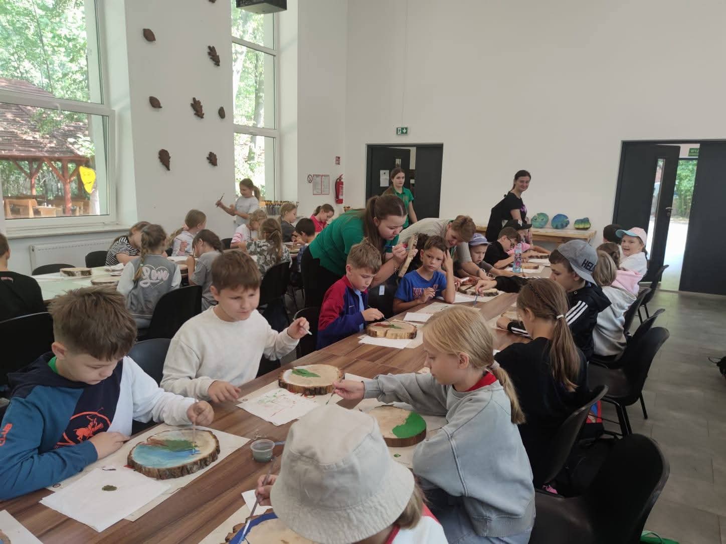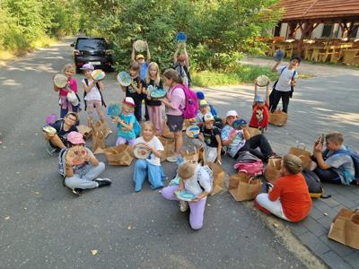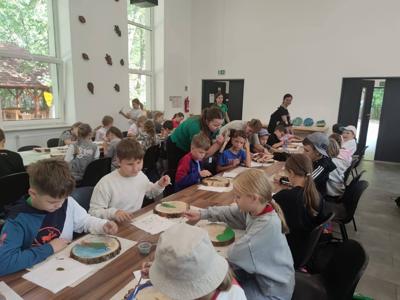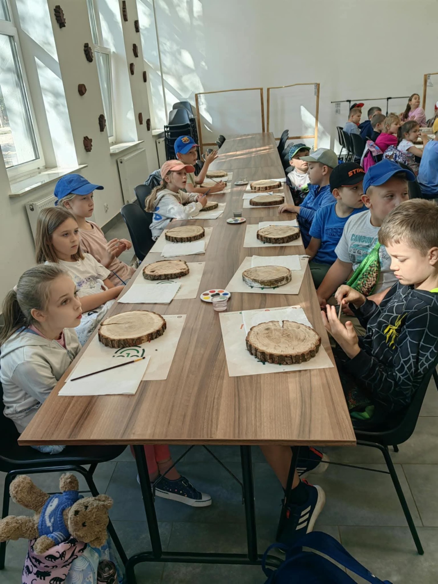 Dzieci miały okazję spędzić czas na świeżym powietrzu odkrywając las poprzez zabawę i poznając wiele jego tajemnic, angażując przy tym wszystkie zmysły😊. Wzięły również udział w warsztatach pt. „Leśny pejzaż”, podczas których tworzyły własne pejzaże na naturalnych plastrach drewna, realizując swoje artystyczne pomysły😃👌.