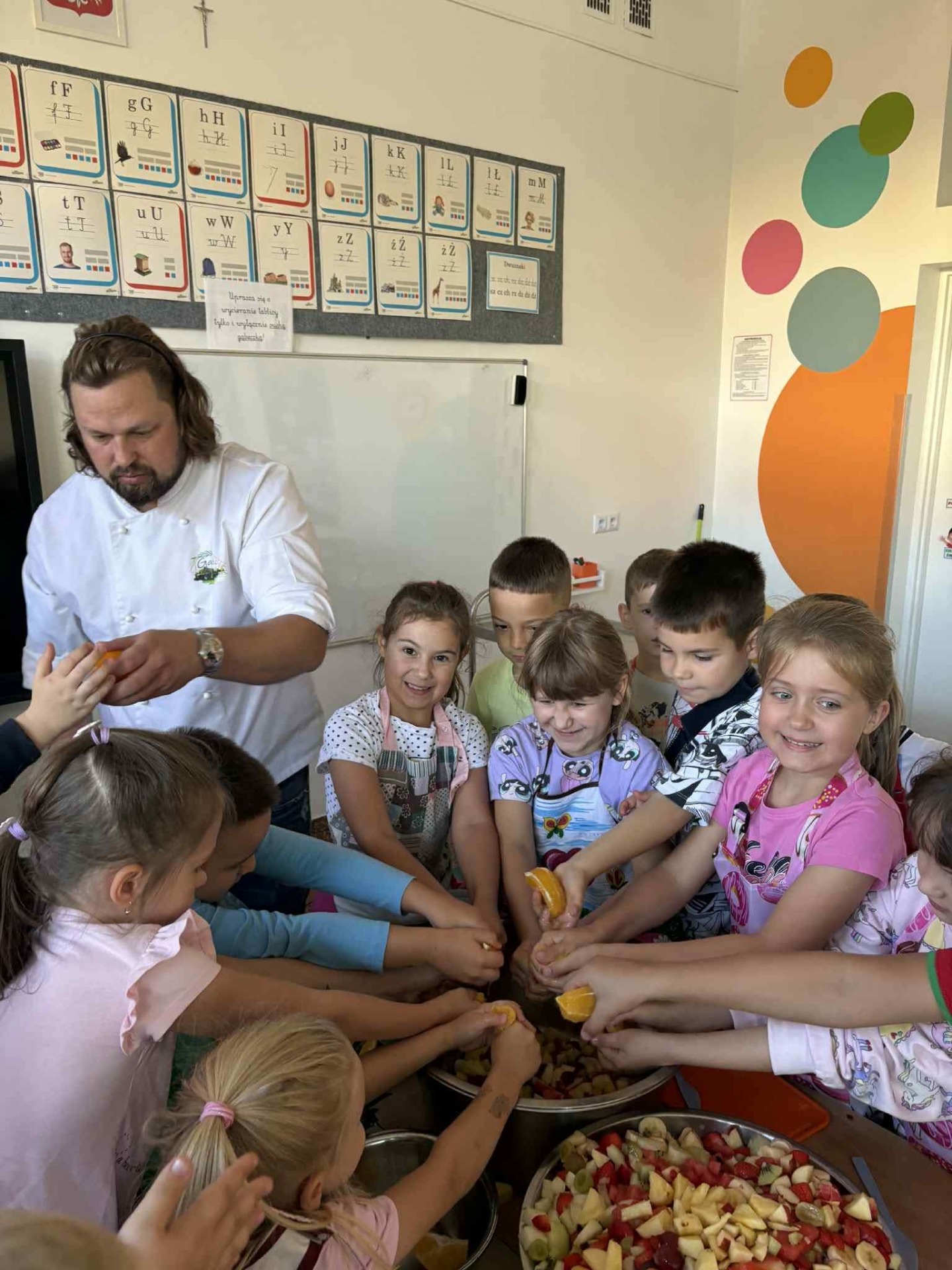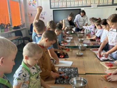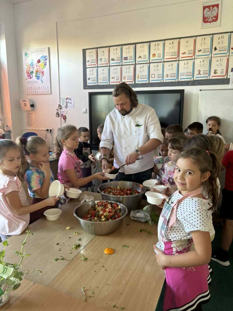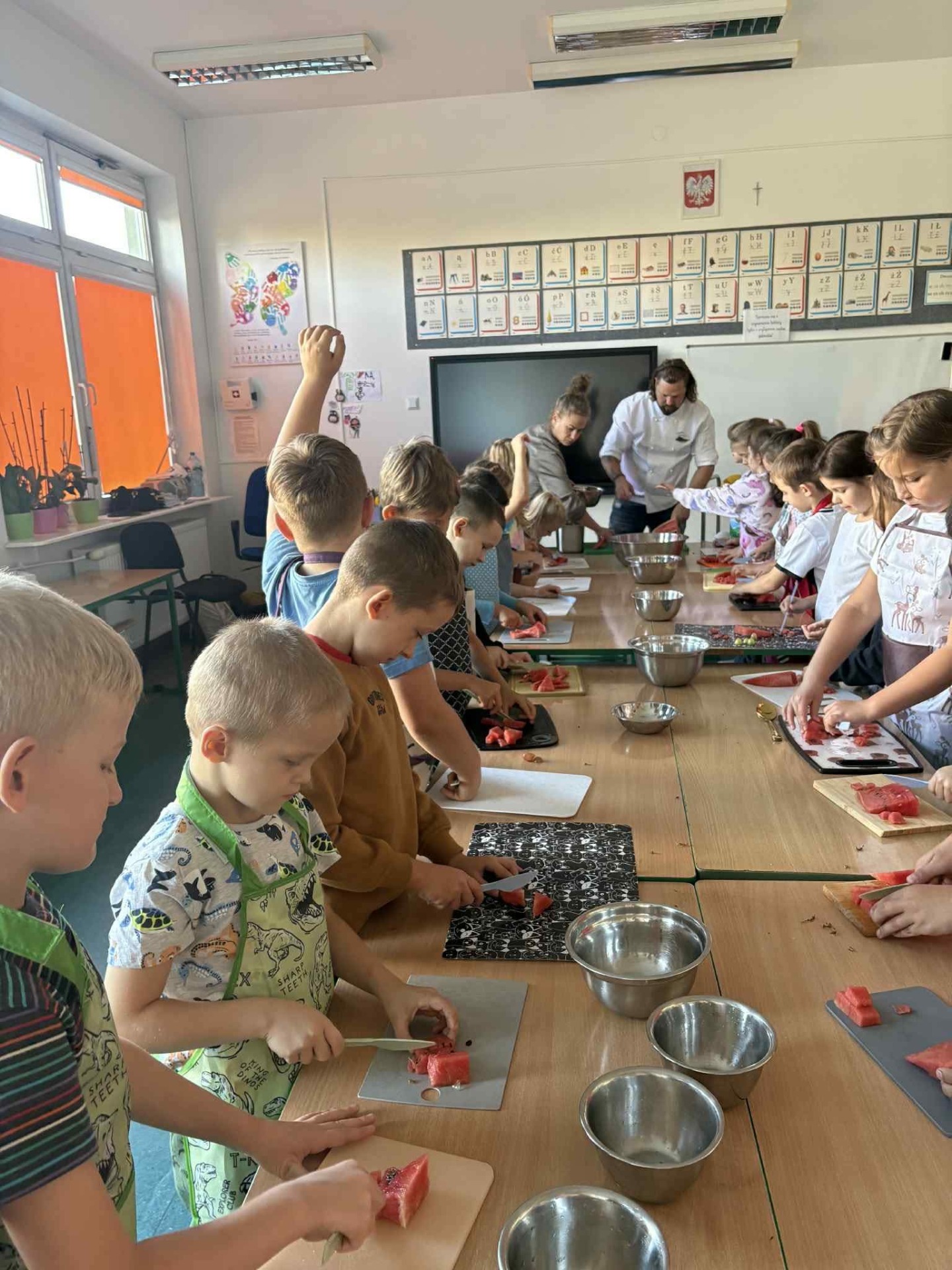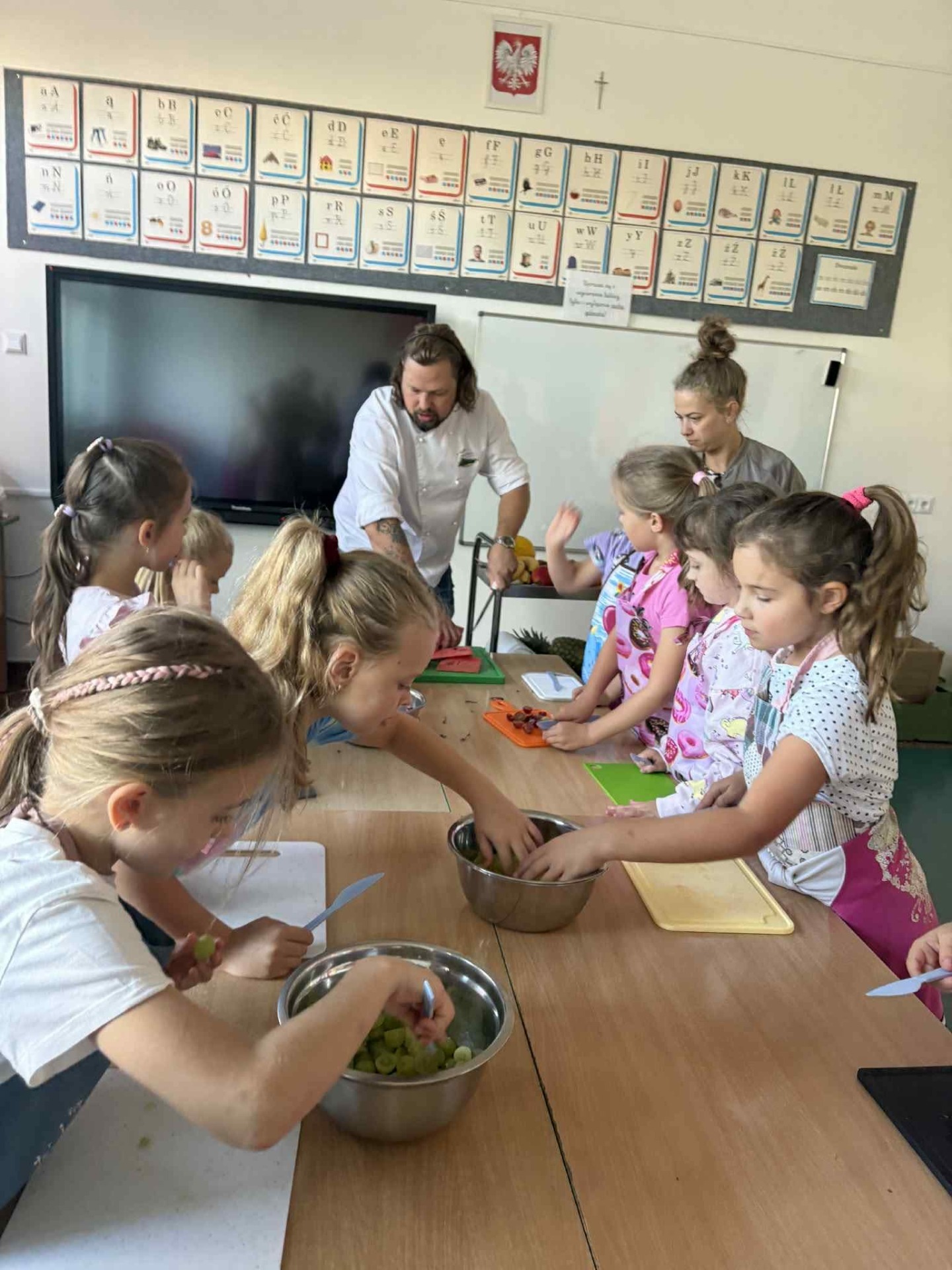 Klasę odwiedził najprawdziwszy kucharz 👨🍳 Pan Michał Stopczyński z Garden Events. Najpierw opowiedział o swoim zawodzie. Potem powiedział dlaczego warto jeść owoce 🍉 i warzywa 🥒. I dlaczego jest to szczególnie ważne jesienią. Następnie dzieci mogły sprawdzić swoją wiedzę o owocach egzotycznych. Następnym punktem programu była wspólna praca przy sałatce owocowej. Dzieci pod okiem pana Michała dzielnie kroiły, siekały i wyciskały wszystkie owoce 🍇 . Po ciężkiej pracy nastąpił najlepszy punkt programu czyli wspólna degustacja. Dziękujemy Panu Michałowi oraz mamie Róży Pani Katarzynie za organizację ciekawego spotkania. Warsztaty odbyły się w ramach doradztwa zawodowego.