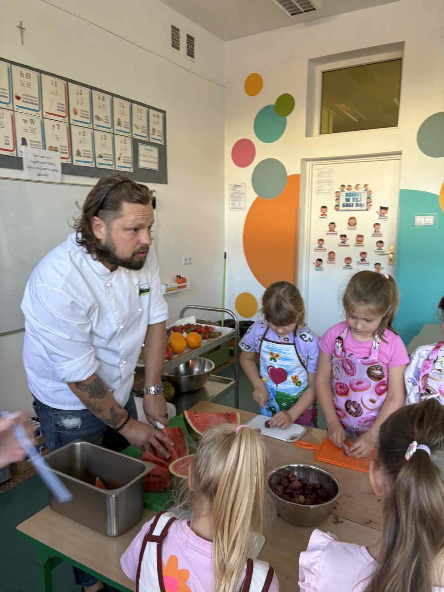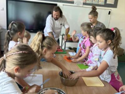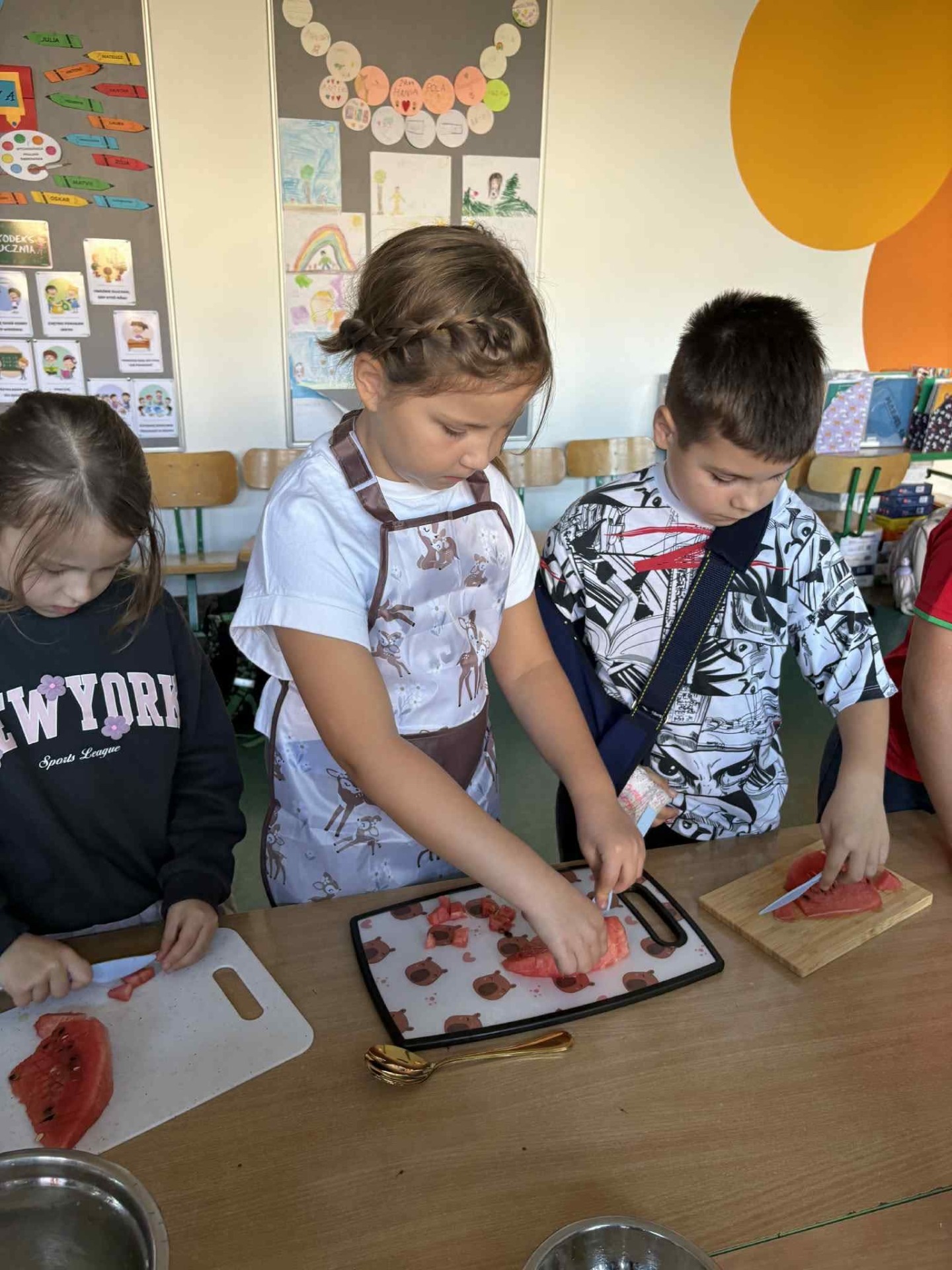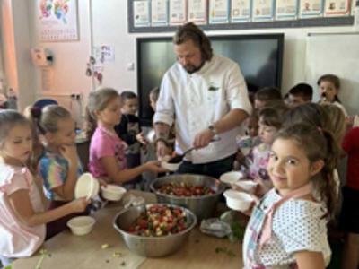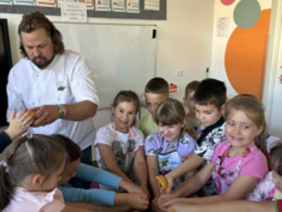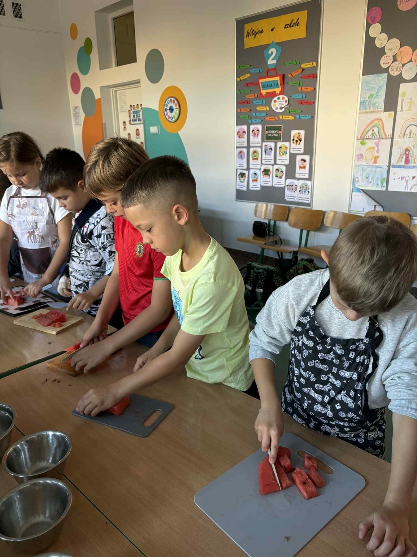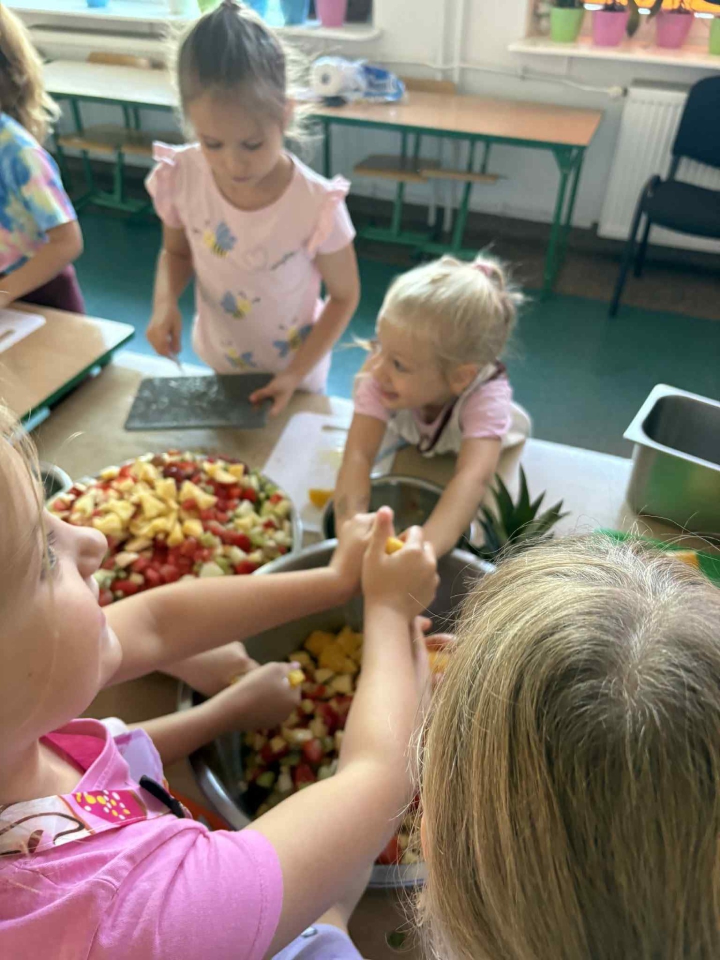 Klasę odwiedził najprawdziwszy kucharz 👨🍳 Pan Michał Stopczyński z Garden Events. Najpierw opowiedział o swoim zawodzie. Potem powiedział dlaczego warto jeść owoce 🍉 i warzywa 🥒. I dlaczego jest to szczególnie ważne jesienią. Następnie dzieci mogły sprawdzić swoją wiedzę o owocach egzotycznych. Następnym punktem programu była wspólna praca przy sałatce owocowej. Dzieci pod okiem pana Michała dzielnie kroiły, siekały i wyciskały wszystkie owoce 🍇 . Po ciężkiej pracy nastąpił najlepszy punkt programu czyli wspólna degustacja. Dziękujemy Panu Michałowi oraz mamie Róży Pani Katarzynie za organizację ciekawego spotkania. Warsztaty odbyły się w ramach doradztwa zawodowego.