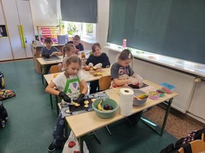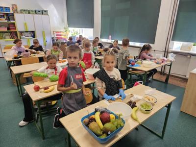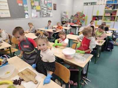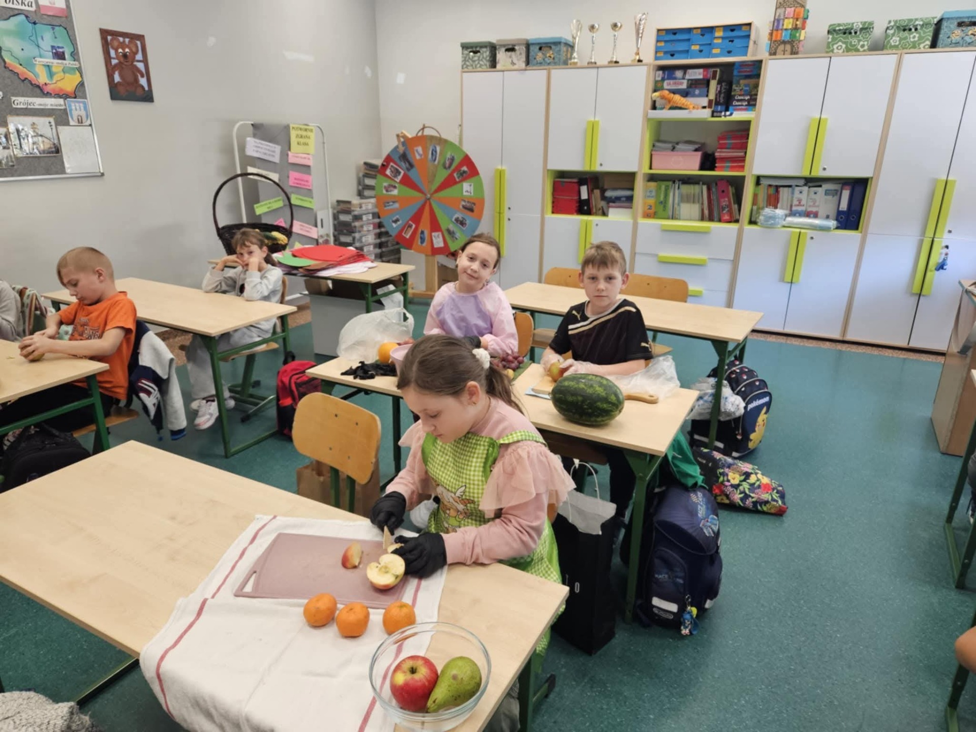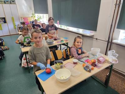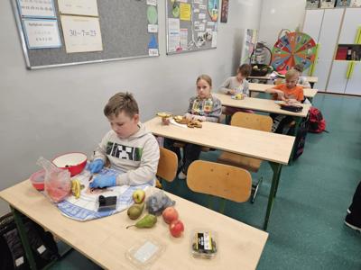 Dzieci przyniosły swoje ulubione owoce, a także — obowiązkowo — jabłka. Z ogromnym zaangażowaniem przygotowywały sałatki owocowe. Uczniowie byli świetnie przygotowani: mieli fartuszki, deski do krojenia, miski i inne potrzebne akcesoria.