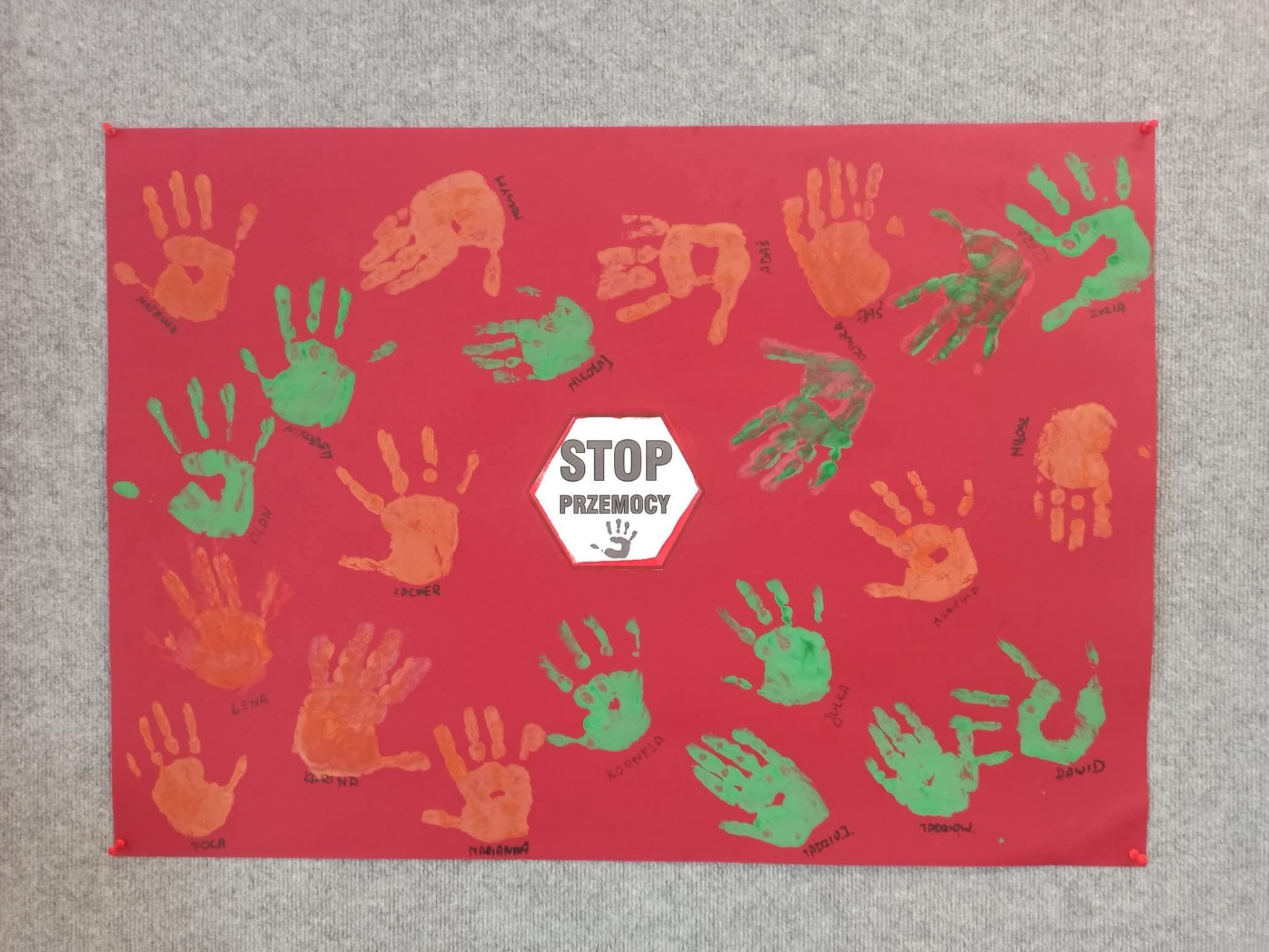 Plakat wykonany przez grupę przedszkolną "Tygryski" ✋w ramach akcji: TYDZIEŃ PRZECIWDZIAŁANIA PRZEMOCY RÓWIEŚNICZEJ