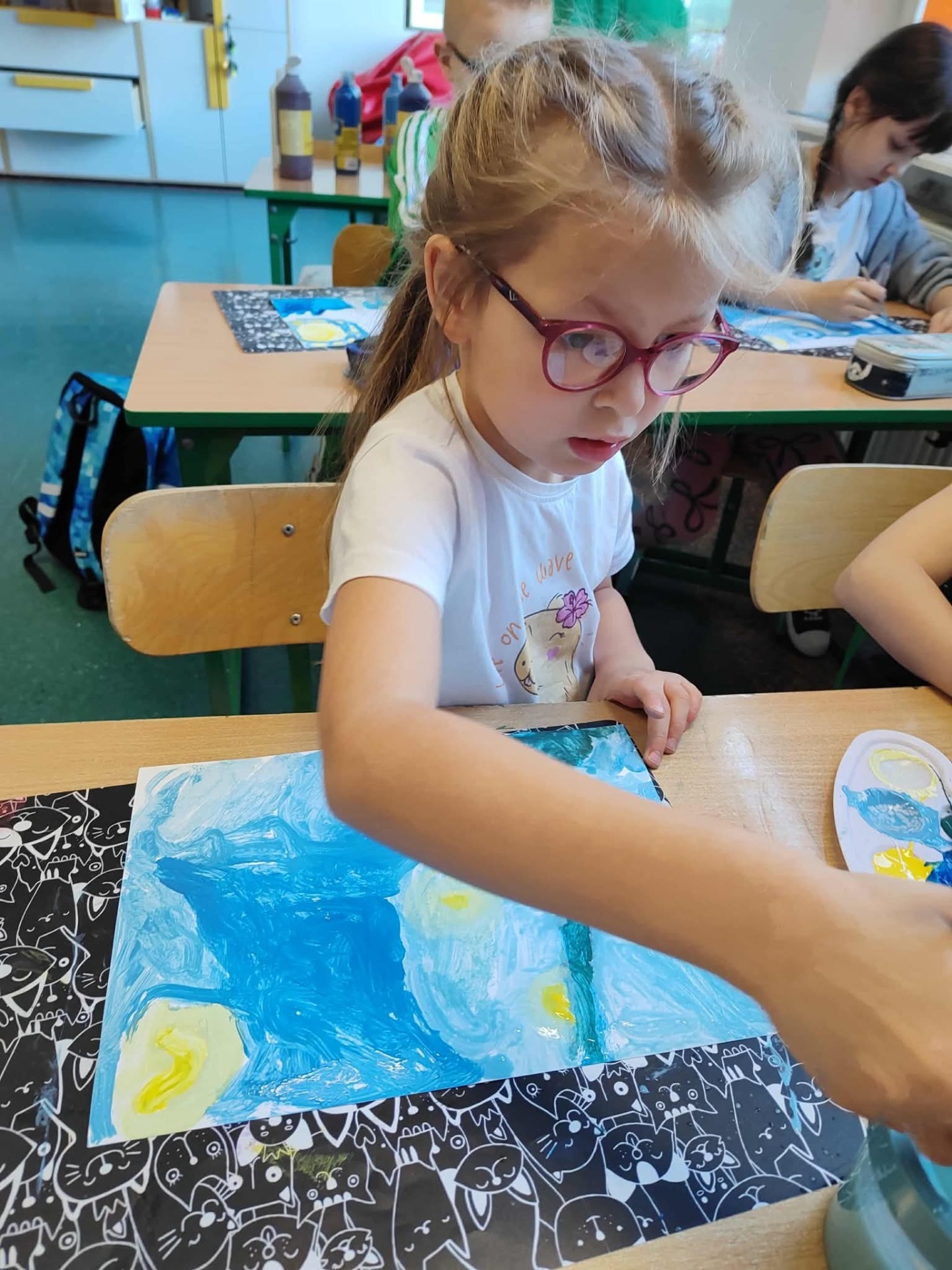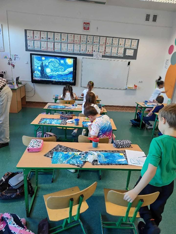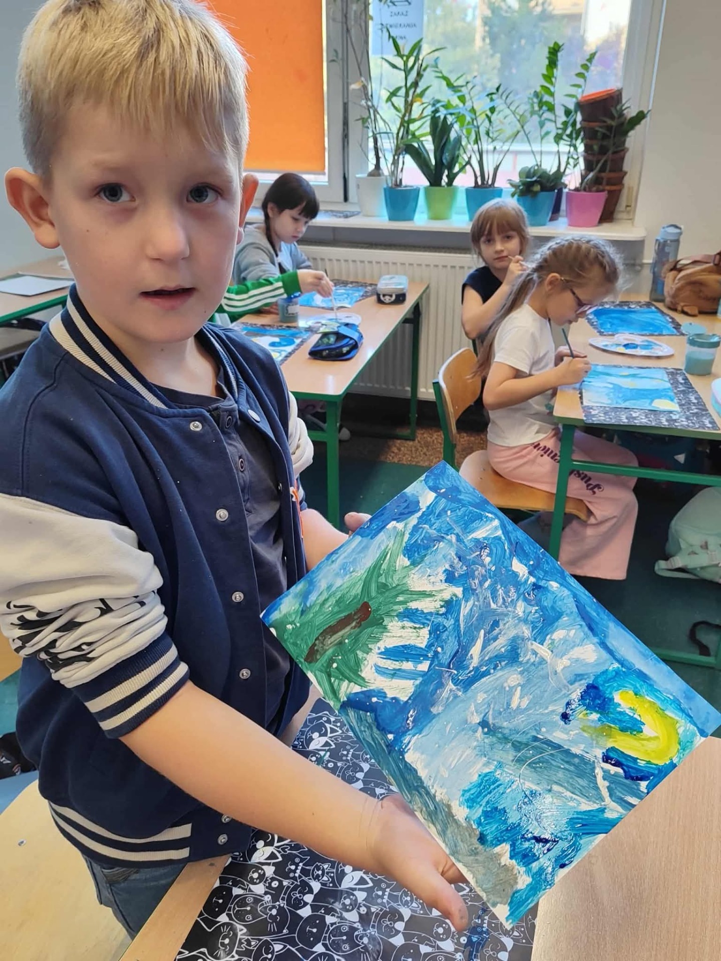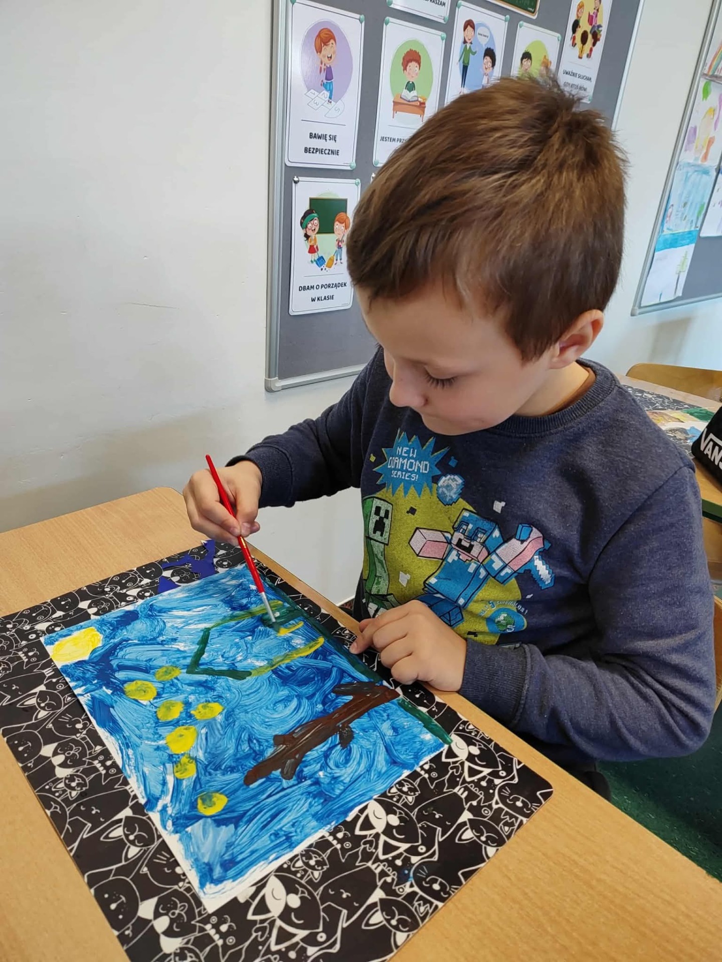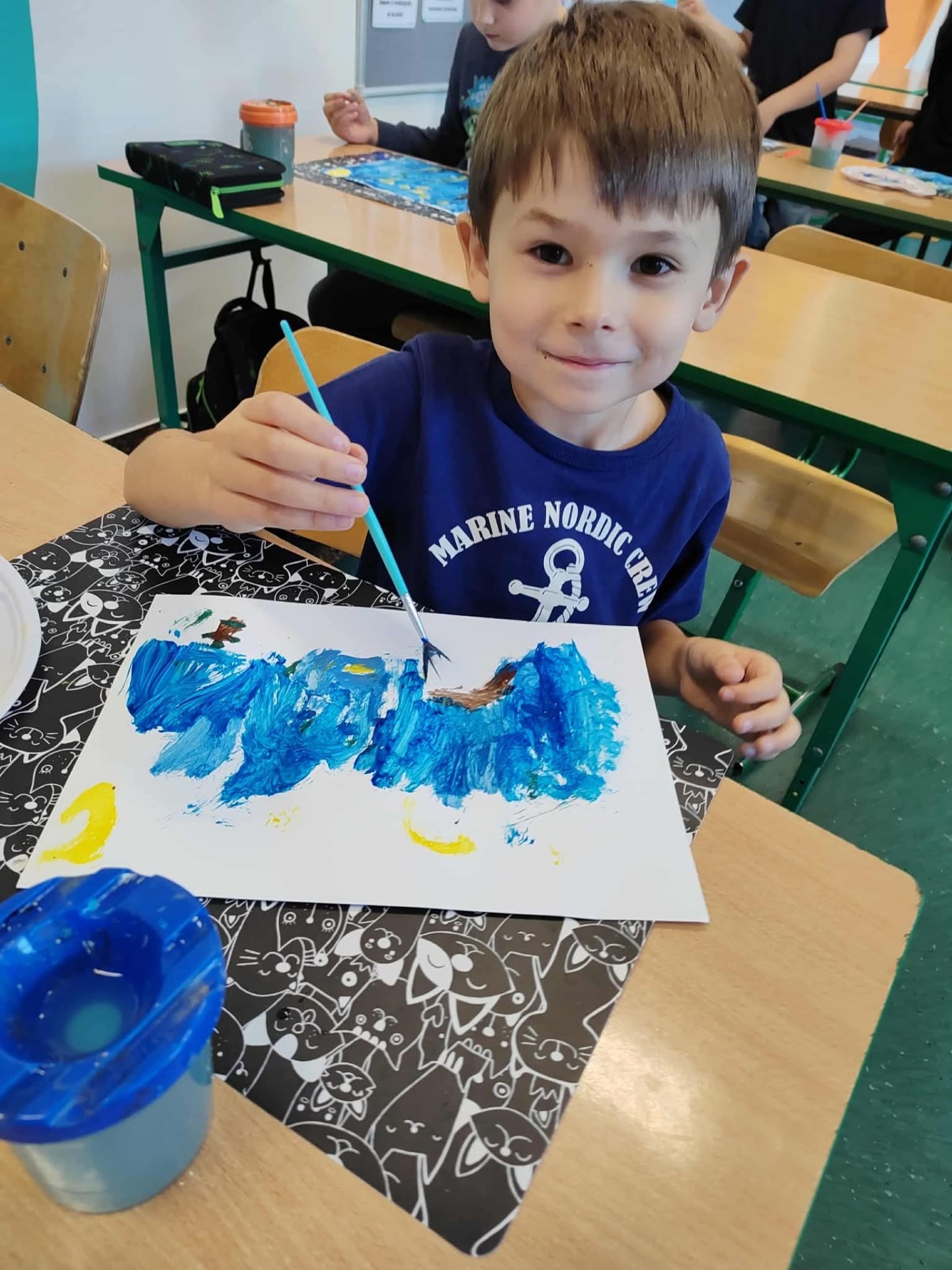 Spotkania ze sztuką w klasie 1f to codzienne zajęcia podczas których uczniowie poznają muzykę klasyczną 🎹oraz najwybitniejszych malarzy 🎨🖌️. A czy można namalować pracę inspirowaną obrazem Van Gogha " Gwieździsta noc" słuchając Chopina Nocturne op 9 no 2 😉?