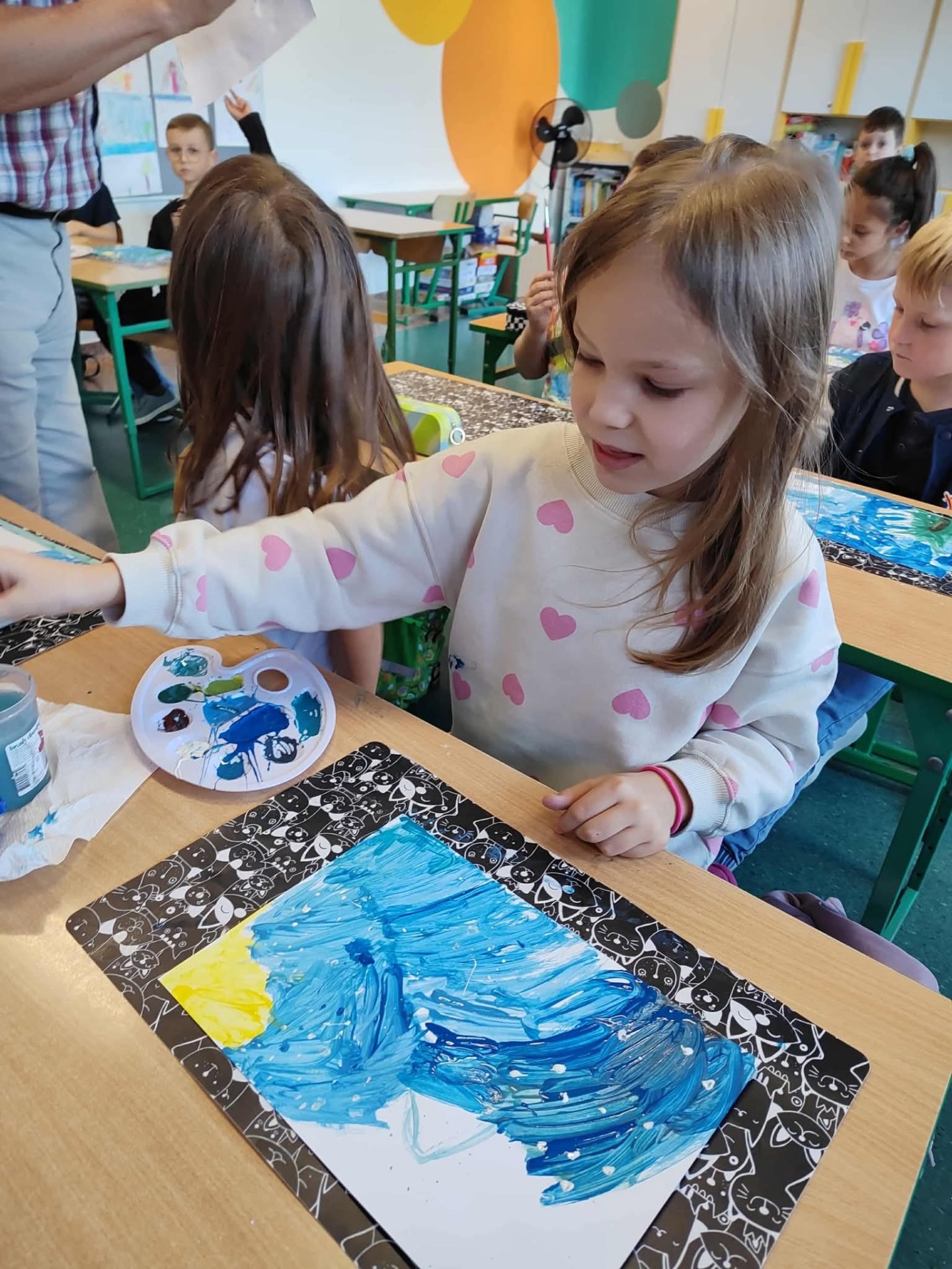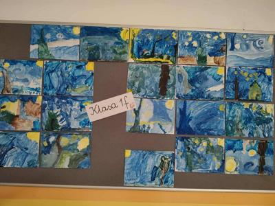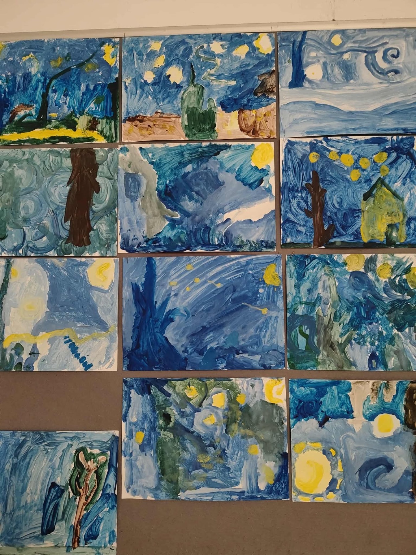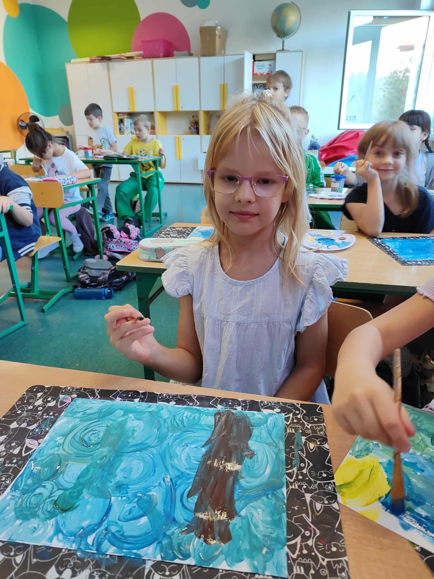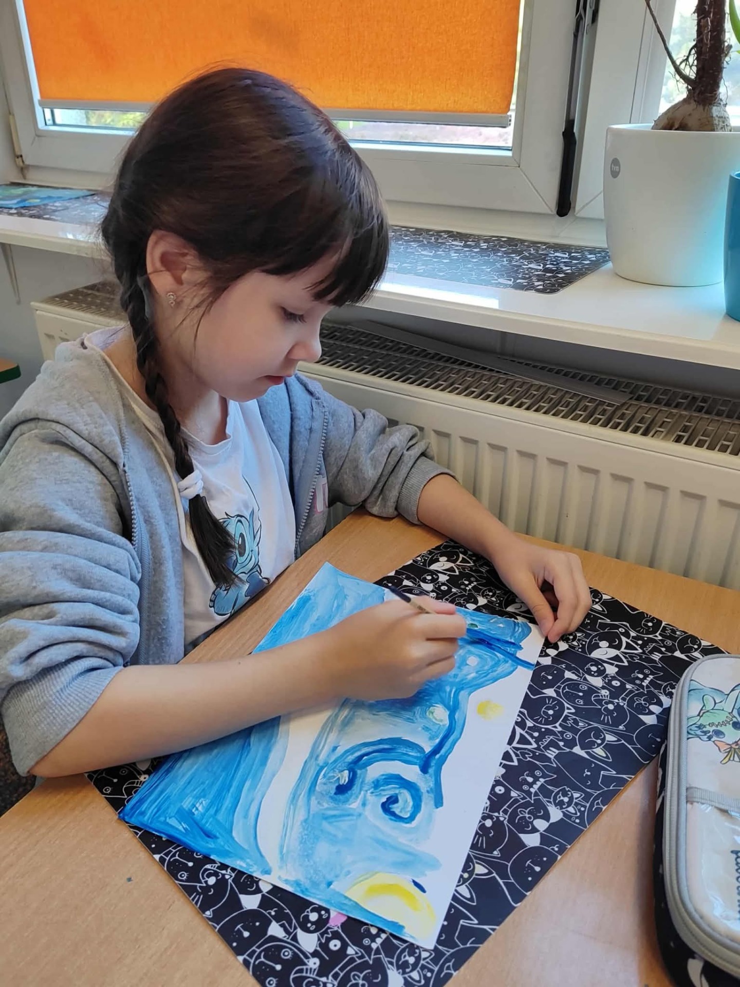 Spotkania ze sztuką w klasie 1f to codzienne zajęcia podczas których uczniowie poznają muzykę klasyczną 🎹oraz najwybitniejszych malarzy 🎨🖌️. A czy można namalować pracę inspirowaną obrazem Van Gogha " Gwieździsta noc" słuchając Chopina Nocturne op 9 no 2 😉?