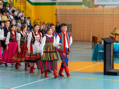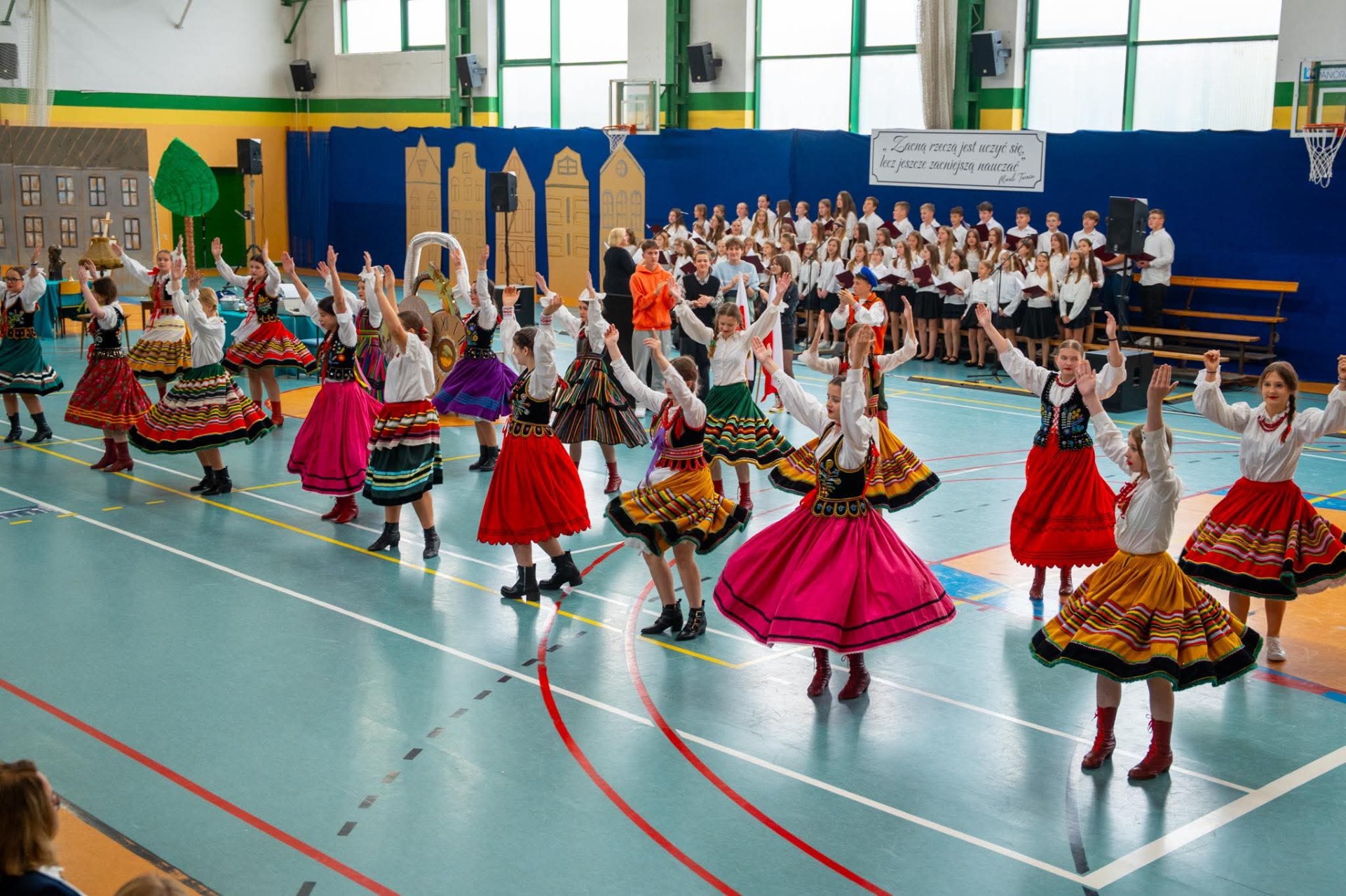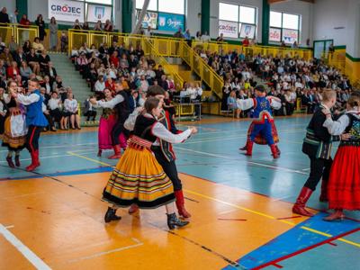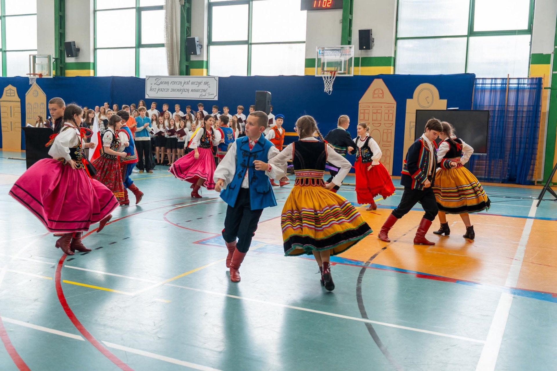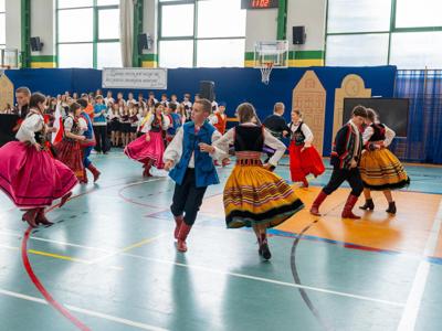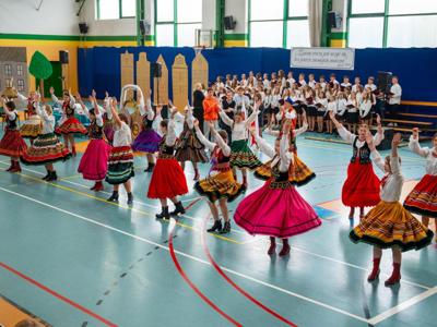 Taniec polka i polonez przygotowali uczniowie klas 7a, 7c, 8b, 8c, 8d pod kierunkiem pań Mileny Frączak i Katarzyny Maciejewskiej-Żyłki