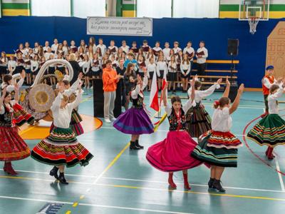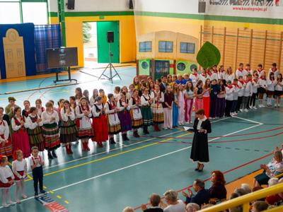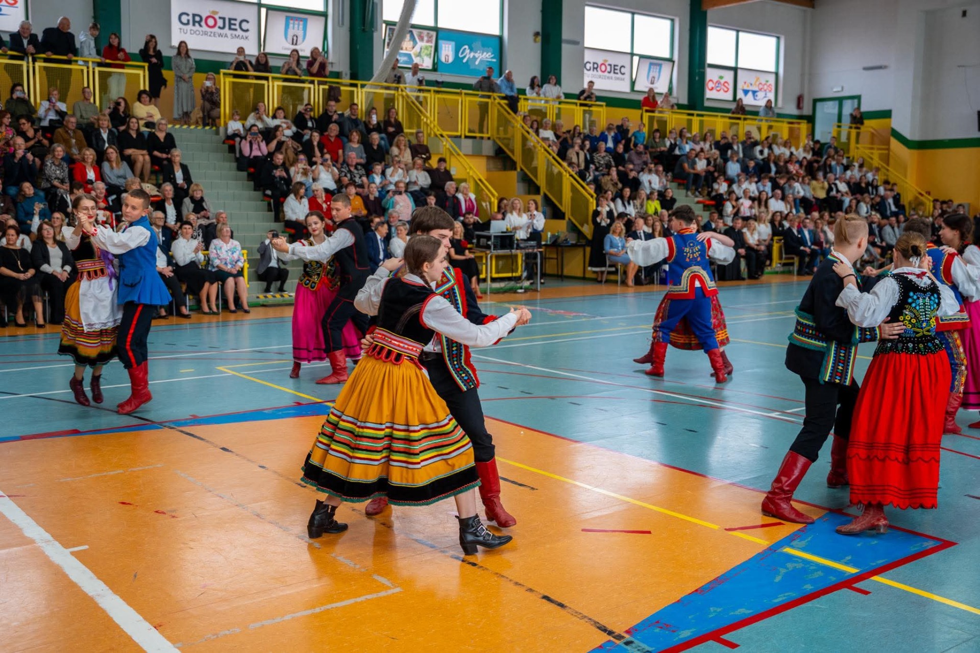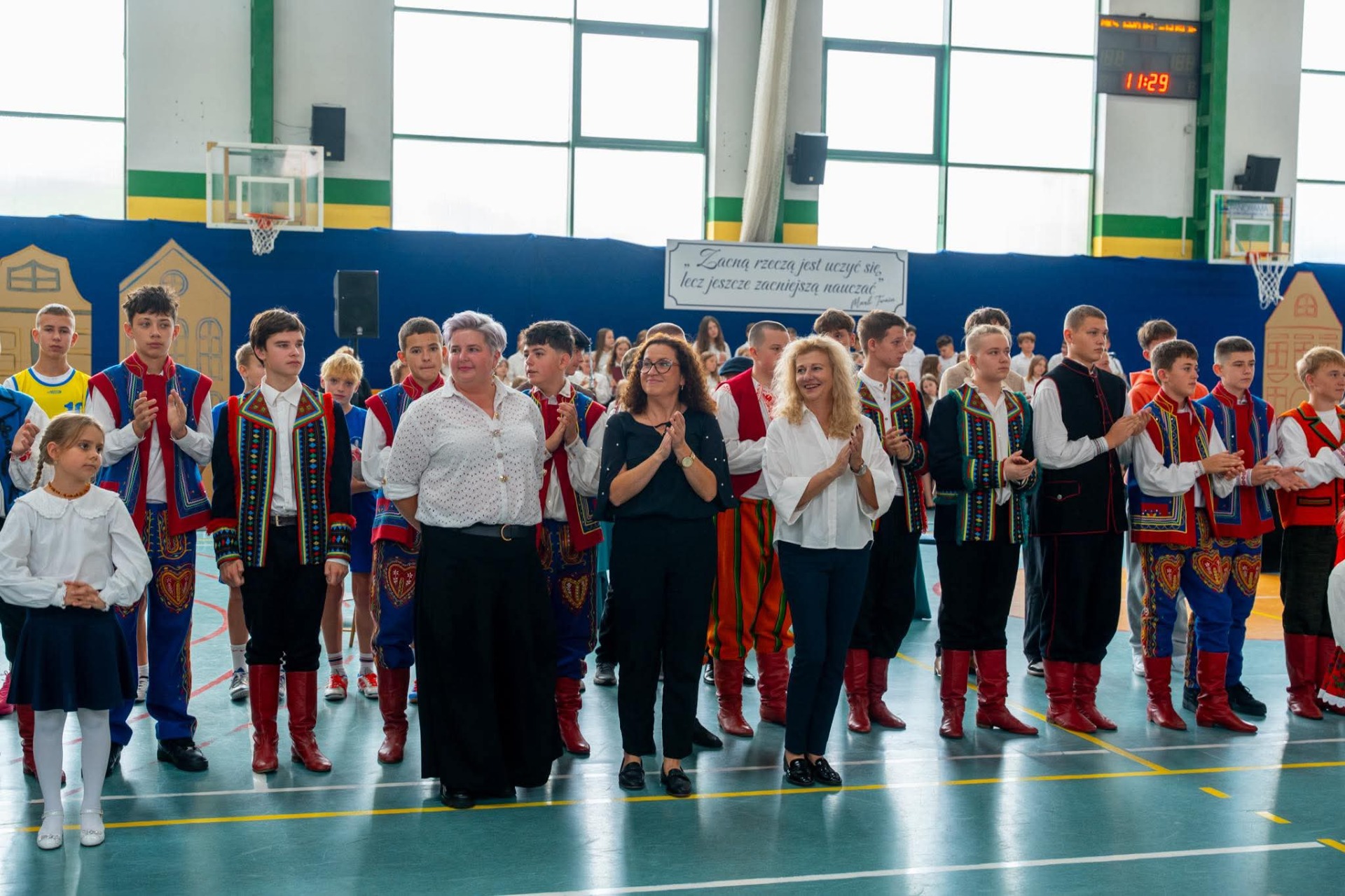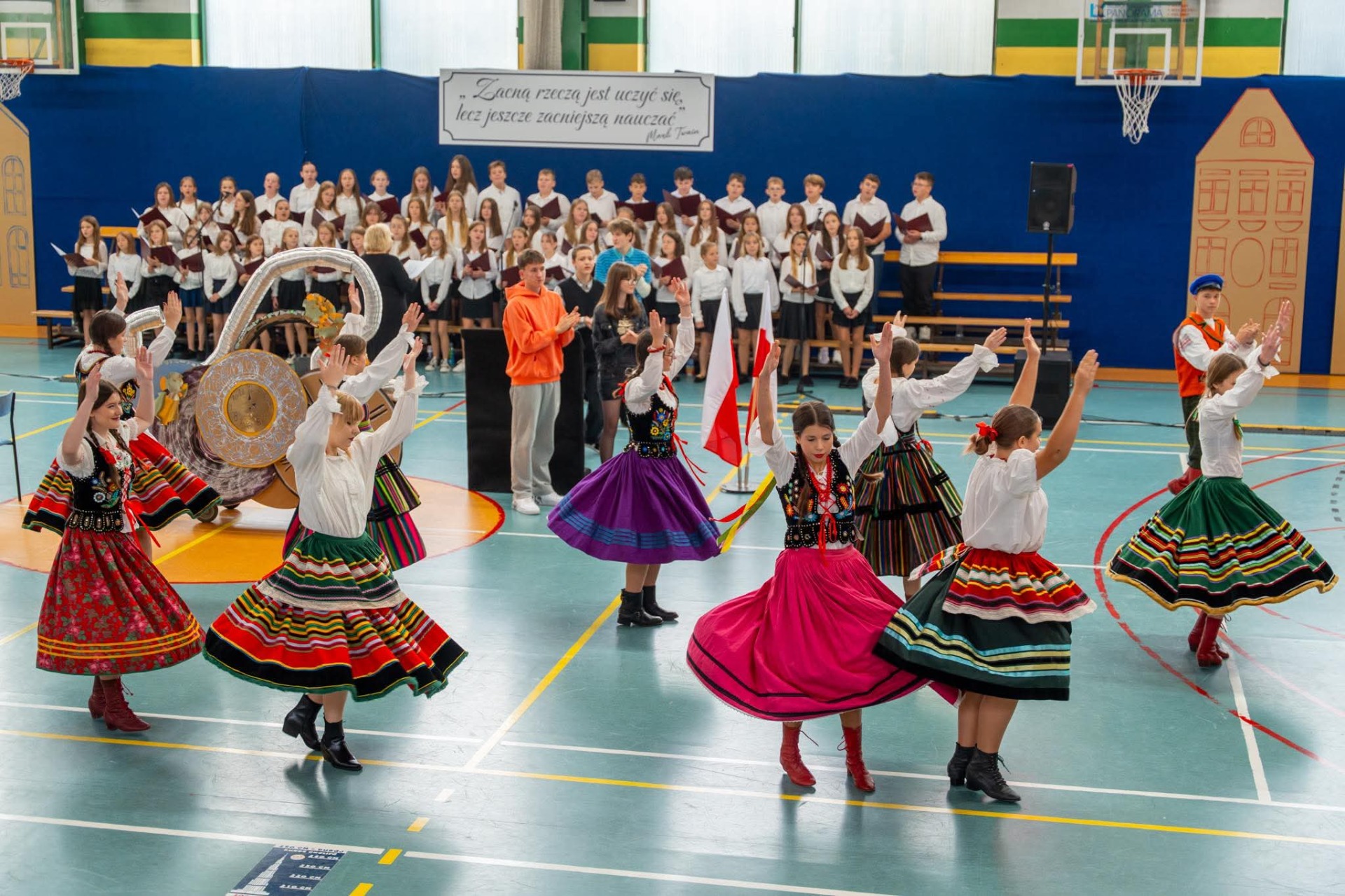 Taniec polka i polonez przygotowali uczniowie klas 7a, 7c, 8b, 8c, 8d pod kierunkiem pań Mileny Frączak i Katarzyny Maciejewskiej-Żyłki