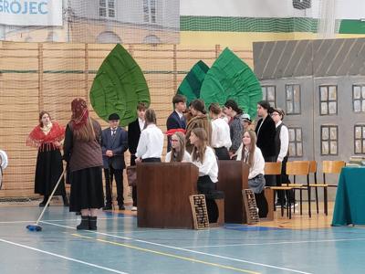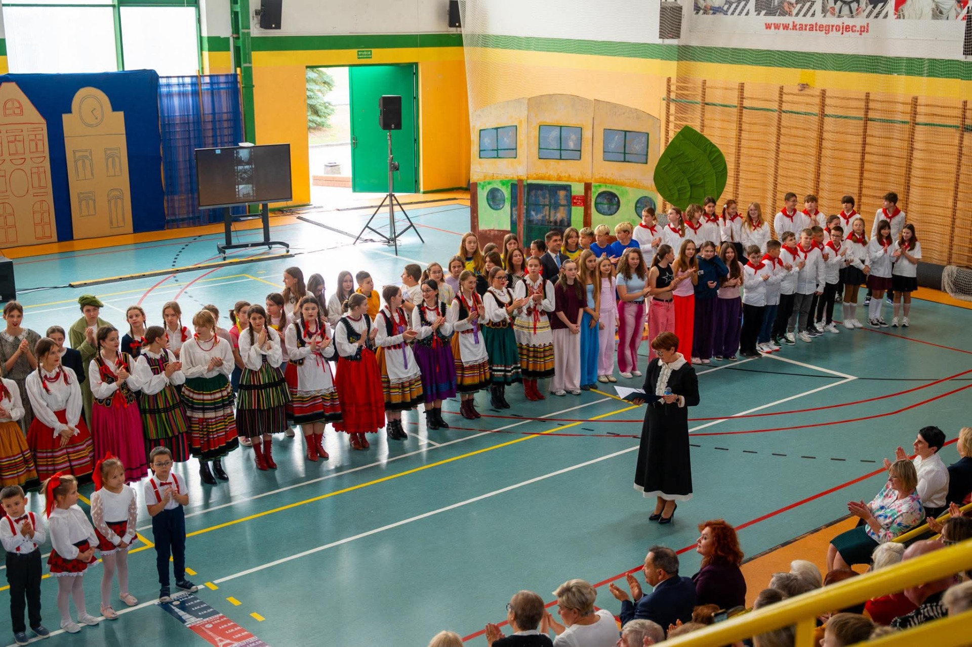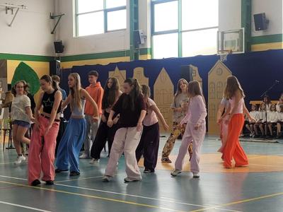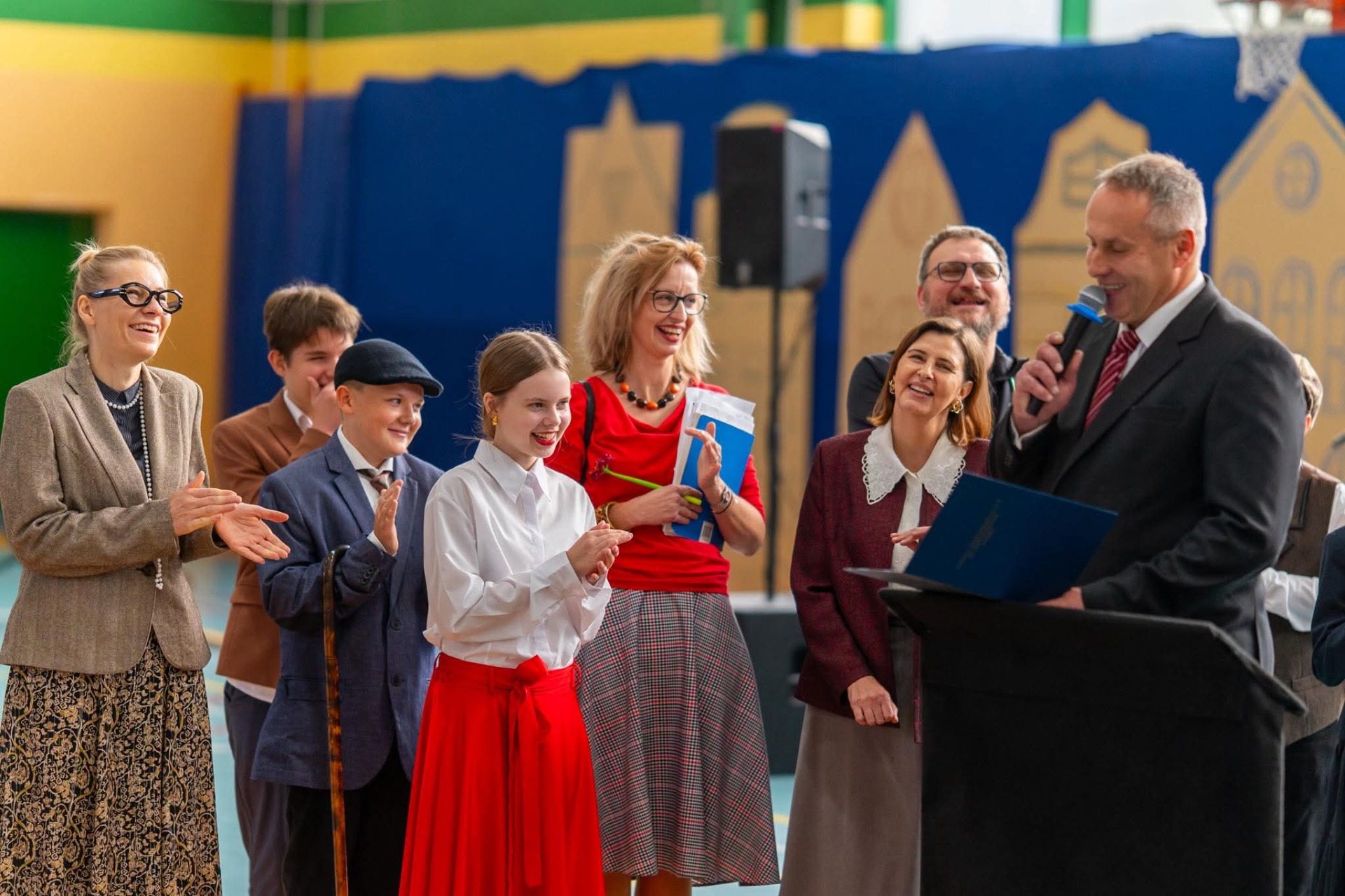 można było zobaczyć blisko kilkuset aktorów, statystów, tancerzy, sportowców oraz chór szkolny, zgromadzeni goście oraz cała Dwójkowa społeczność zostali zaproszeni do niezwykłej podróży w czasie — pełnej wzruszeń, śmiechu i refleksji nad tym, jak bardzo zmieniała się nasza szkoła, a jednocześnie jak wierna pozostawała swoim wartościom.