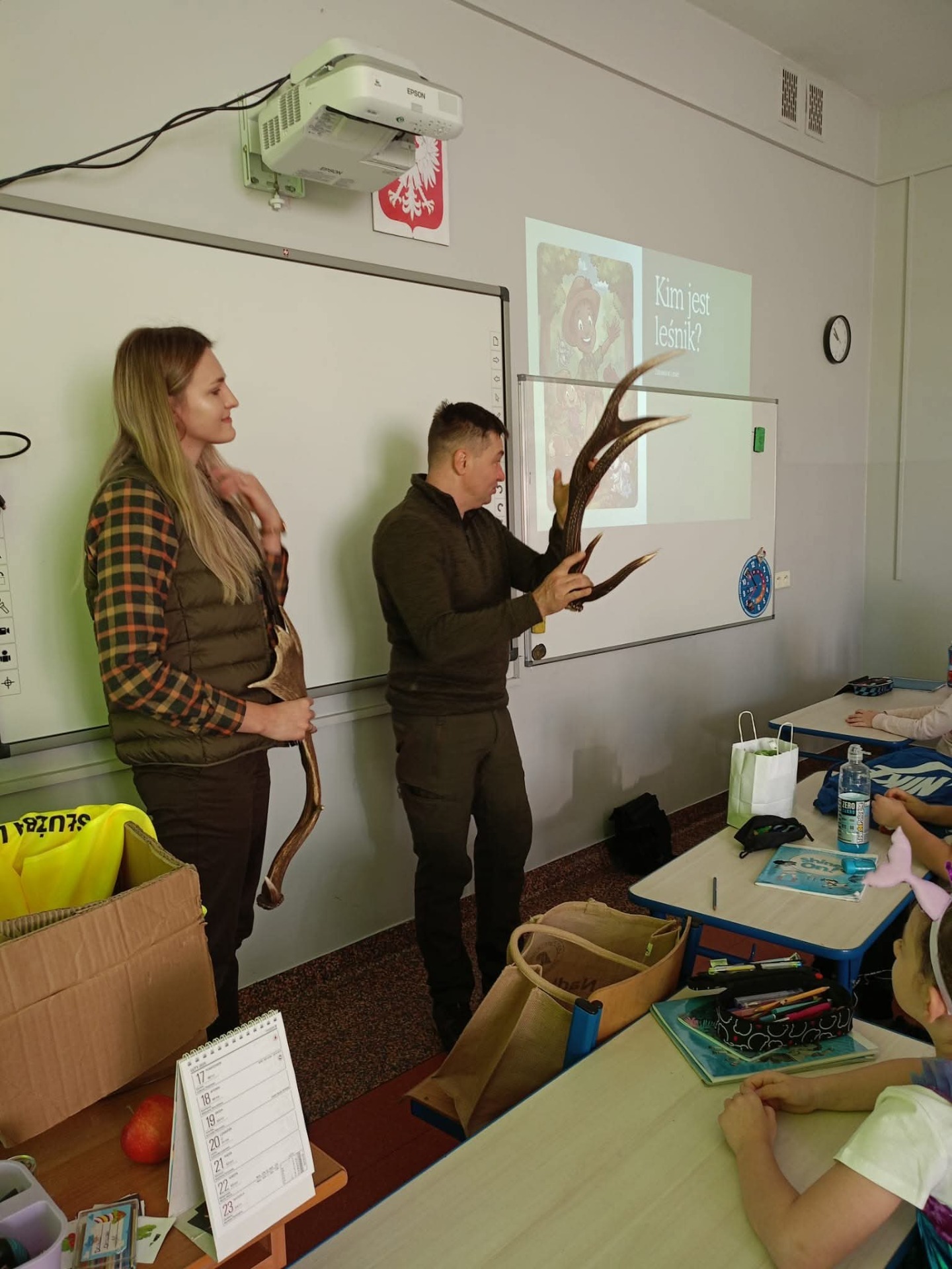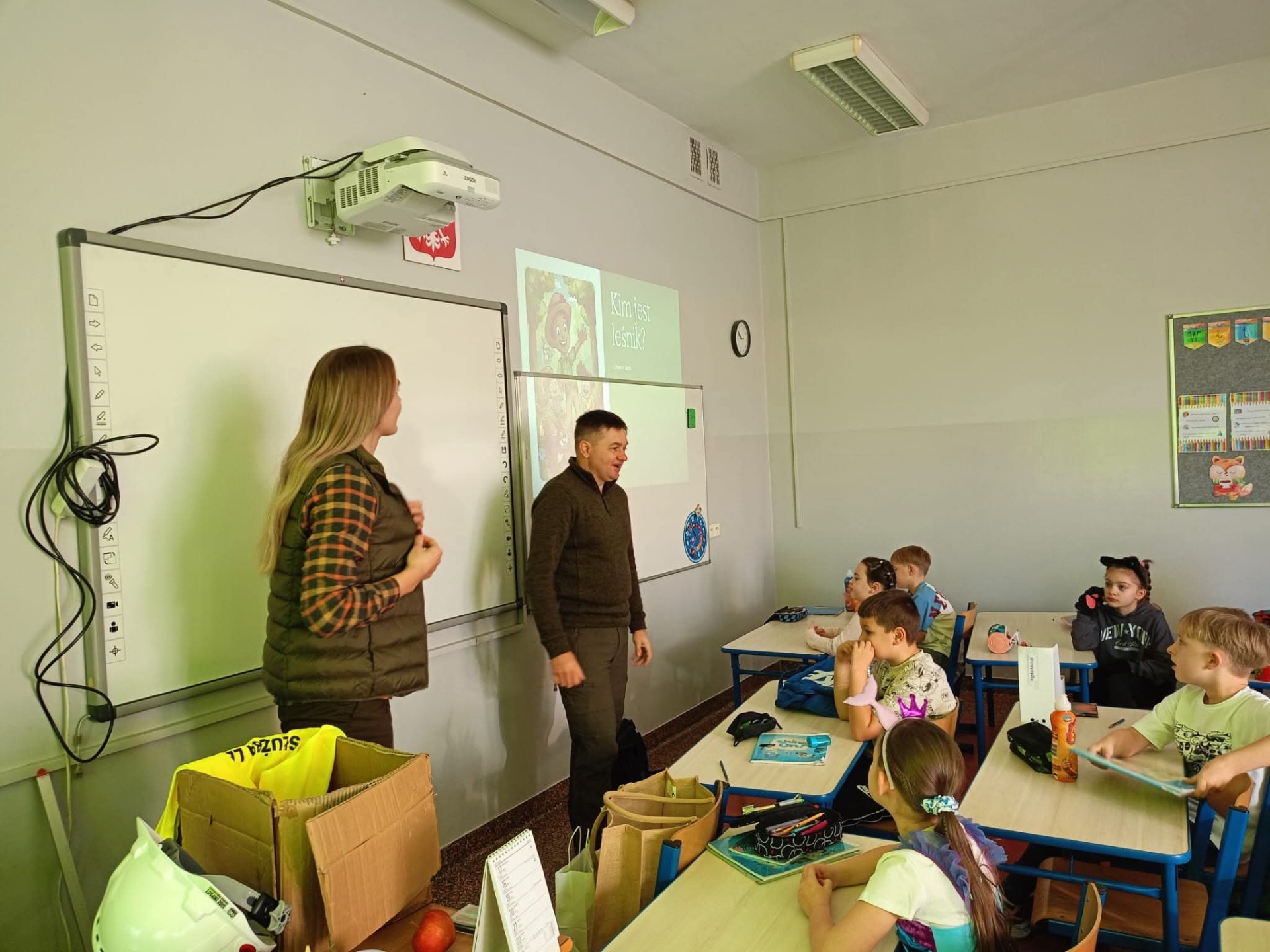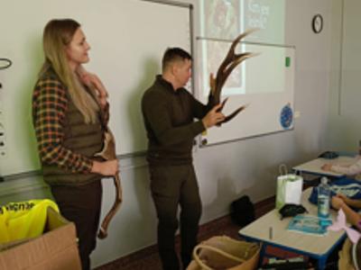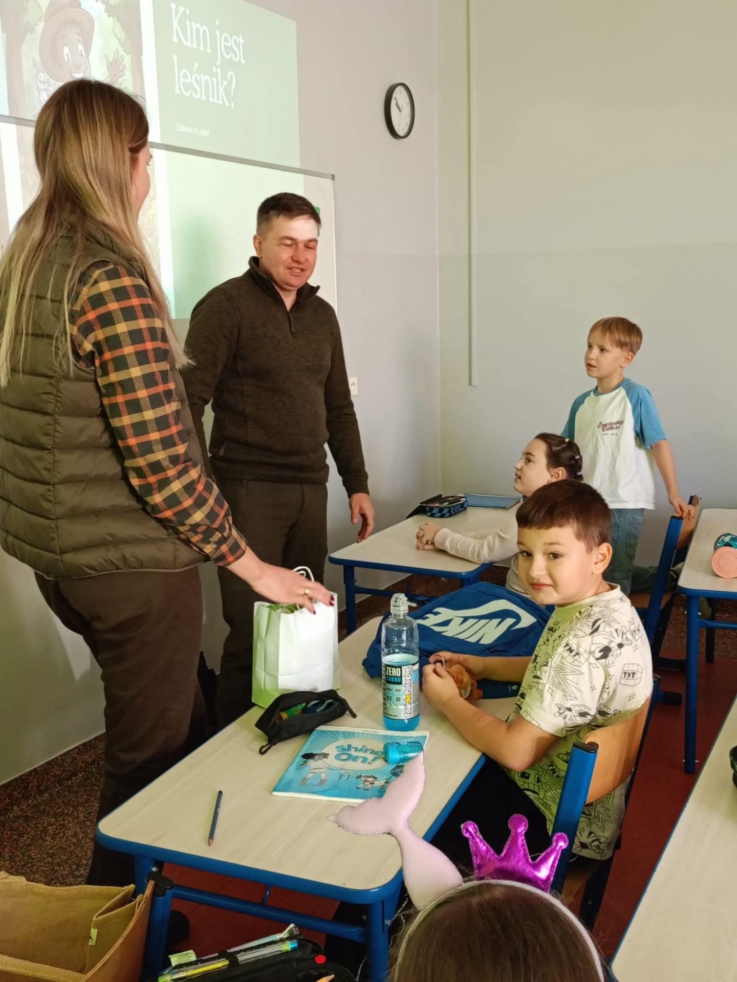 W ramach szkolnego doradztwa zawodowego uczniowie klasy 2c gościli przedstawicieli Nadleśnictwa Grójec - Panią Magdalenę oraz Pana Marcina. Celem zajęć z leśnikiem w szkole było zapoznanie uczniów z pracą leśnika, pokazanie znaczenia lasów dla środowiska oraz nauczenie zasad właściwego zachowania się w lesie i ochrony przyrody. Dzieci dowiedziały się o roli leśnika jako opiekuna lasu i jego mieszkańców, poznały gatunki drzew i zwierząt leśnych, a także dowiedziały się, jak unikać zagrożeń dla lasu, takich jak pożary.