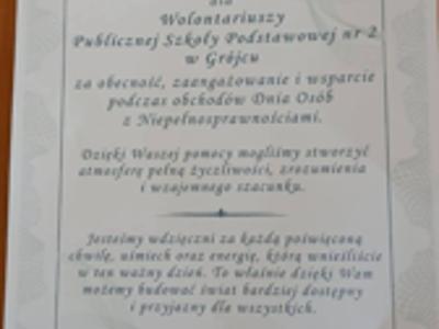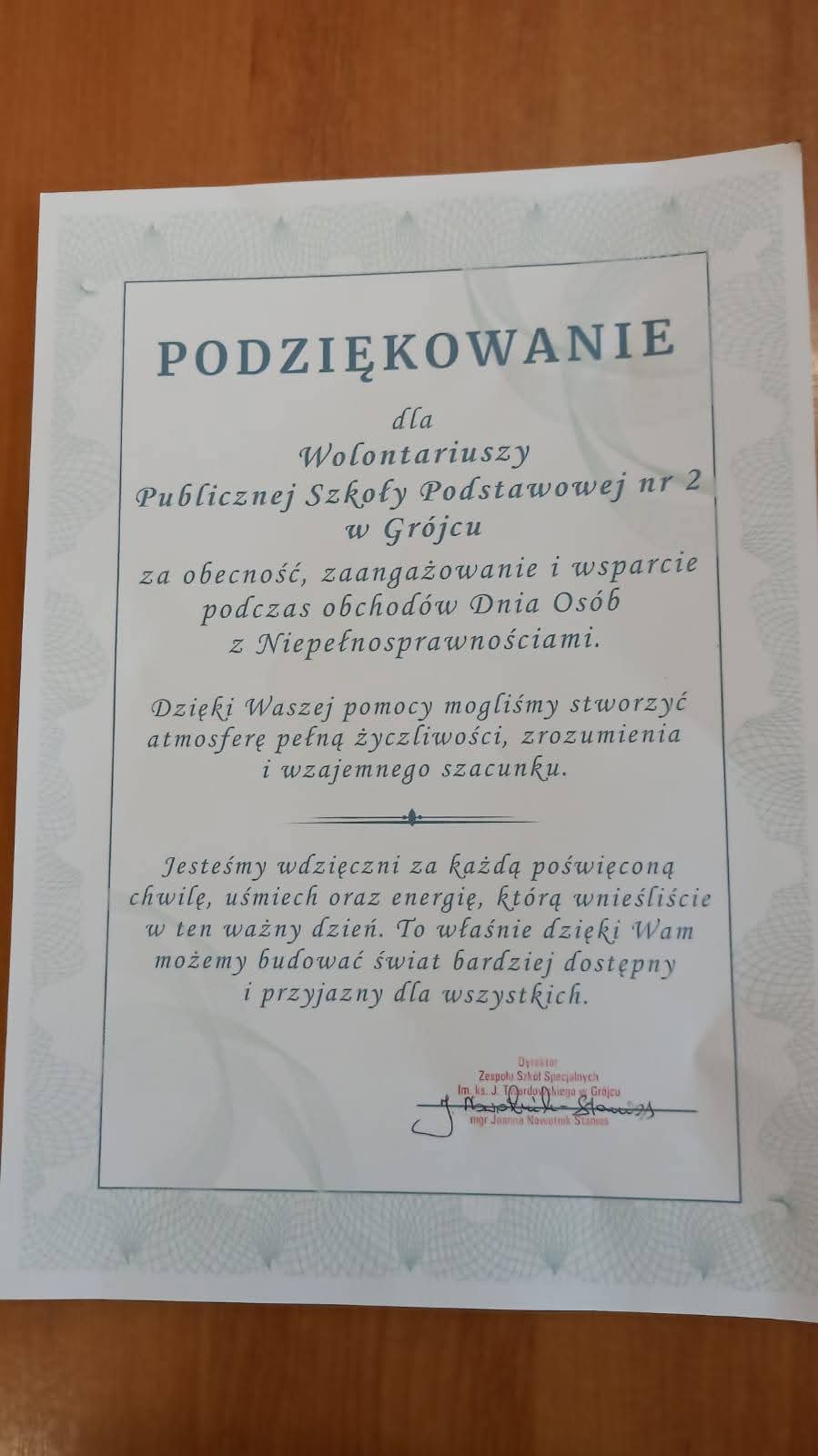 Wolontariusze z naszej szkoły otrzymali podziękowanie od Zespołu Szkół Specjalnych za obecność, zaangażowanie i wsparcie podczas obchodów Dnia Osób z Niepełnosprawnościami. Jesteśmy z Was dumni! 👏💛