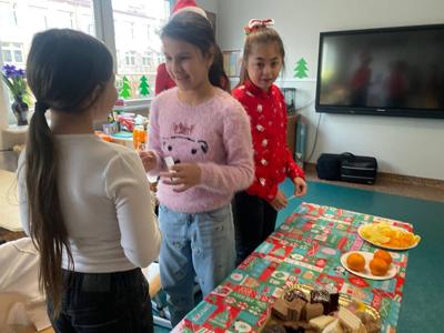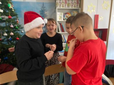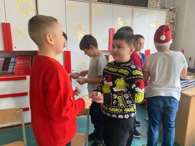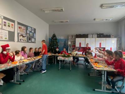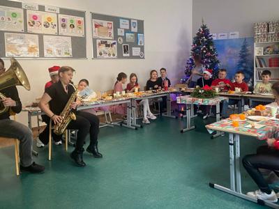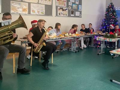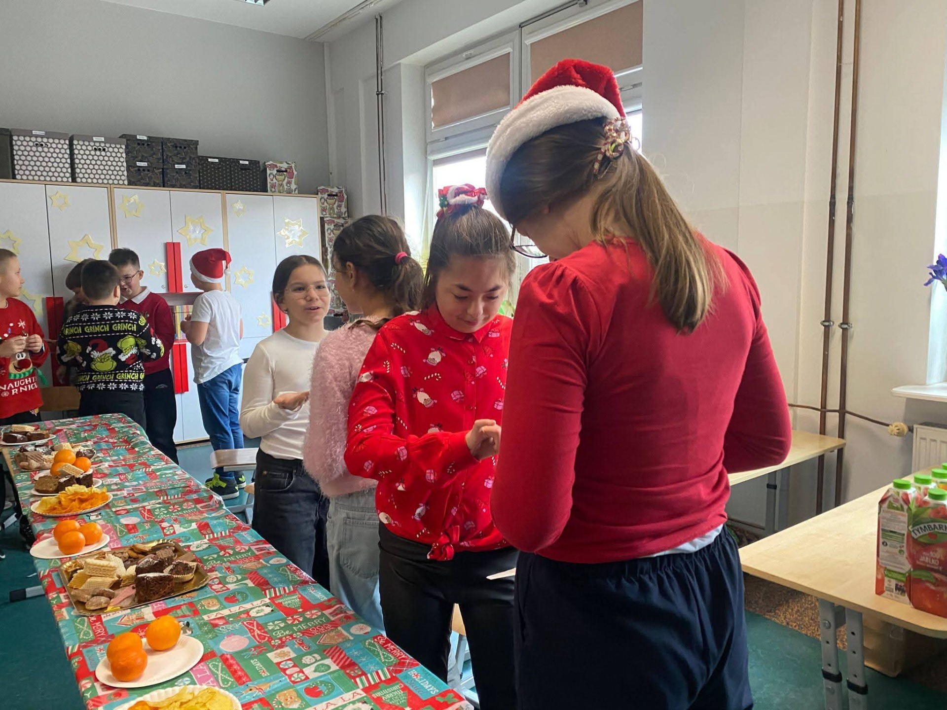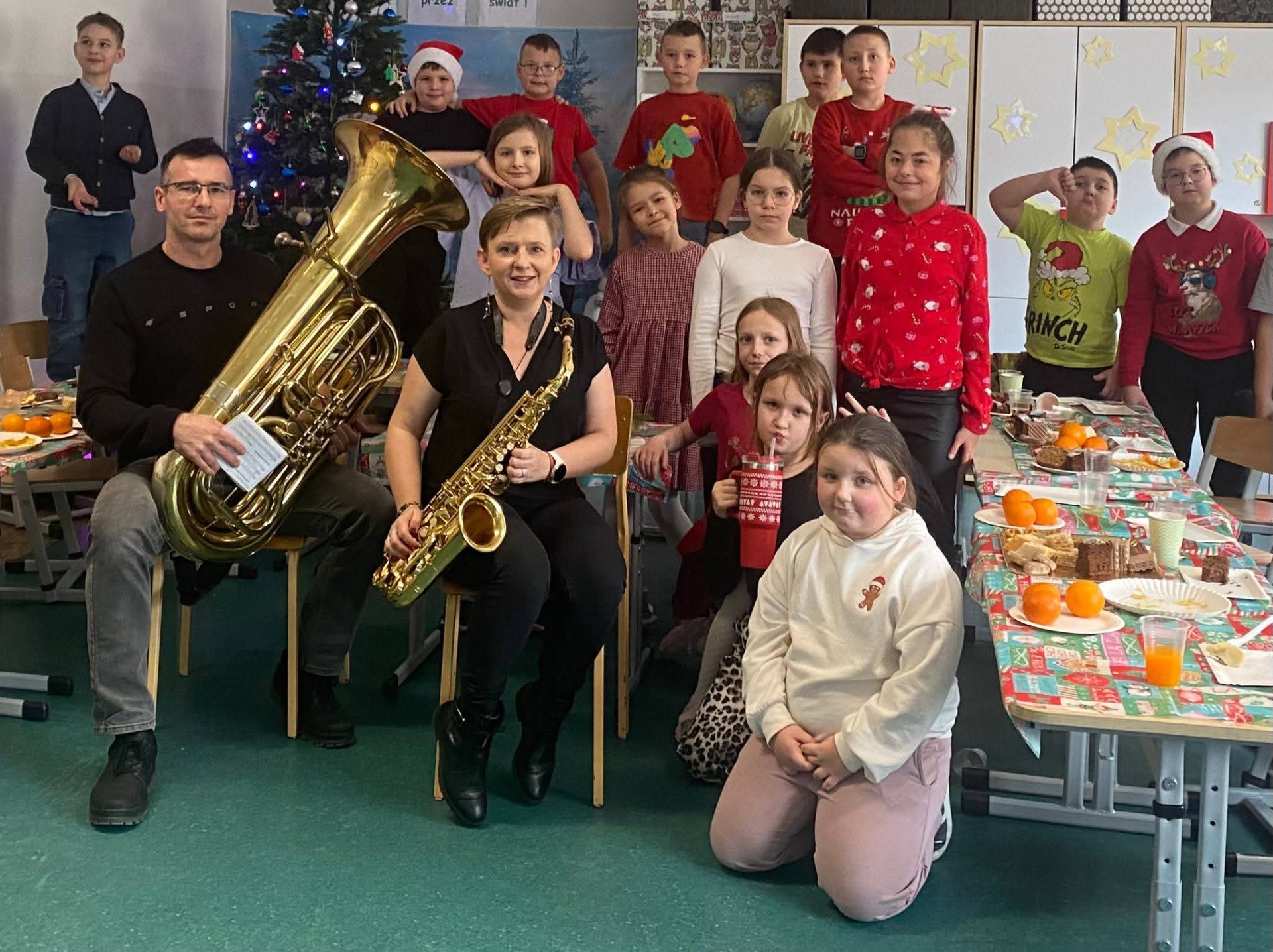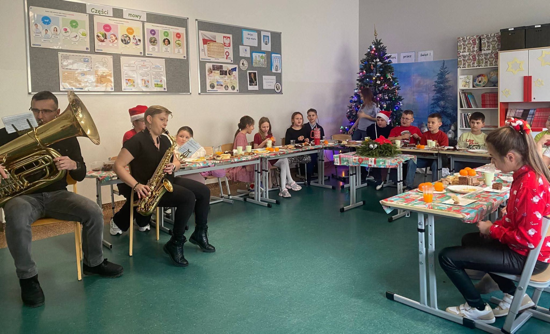 Następnie uczniowie zasiedli do wspólnego stołu, na którym pojawiły się tradycyjne potrawy wigilijne. Ważnym momentem było również wspólne śpiewanie kolęd. Ich dźwięk wypełnił całą salę, a wyjątkowy klimat stworzył muzyczny akompaniament – p. Magda grała na saksofonie, a p. Andrzej na tubie, dodając kolędom niepowtarzalnego brzmienia😃.